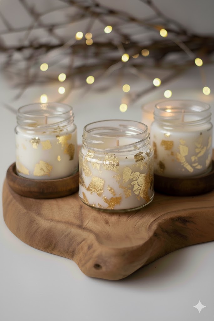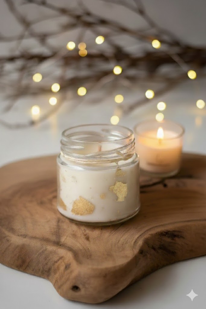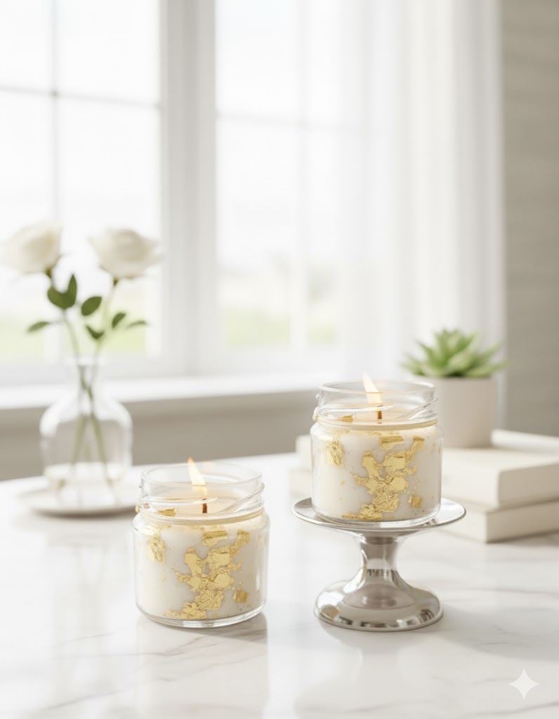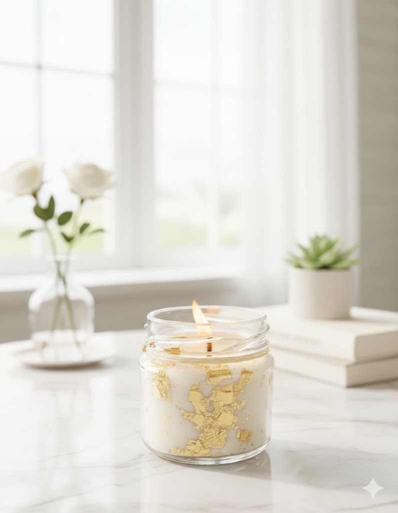 Composição: Cera de coco vegetal de alta qualidade + essência premium + pavil de algodão + folhas sintéticas de ouro + pote de vidro com tampa.