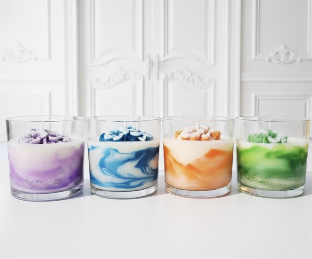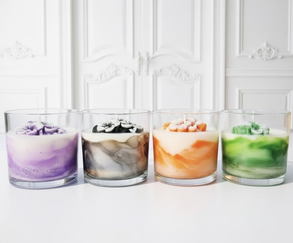 No topo da vela, uma deslumbrante Flor de Cerejeira se revela, artisticamente mesclada em tons que capturam sua essência. A exclusividade continua com o efeito marmorizado nas laterais do copo de vidro, um design único que harmoniza perfeitamente com as cores da flor, criando um visual sofisticado e cativante.